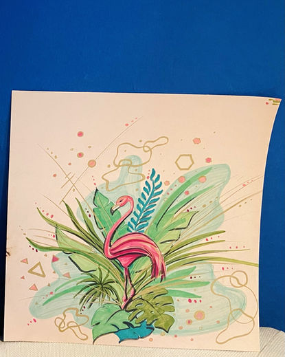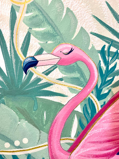 This painting is decorating a residential homes bedroom. My original idea came earlier this year of a Flamingo with tropical leafes around her. Then later on I reworked it to be more dynamic